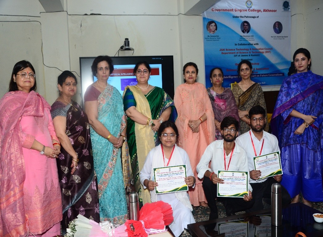 One Day Workshop On Science, Technology & Innovation :GDC Akhnoor, in collaboration with the J&K Science, Technology & Innovation Council (DST), organized a One-Day Workshop on 25-09-2025 on “Science, Technology and Innovations with Emphasis on Artificial Intelligence,” where Principal Prof. (Dr.) Romilla Malla Bhat emphasized the importance of AI in Higher Education and scientific temperament, followed by a keynote address by Prof. Parveen Lehana from the University of Jammu on AI, Machine Learning of the Brain, and their societal impact; the event was graced by DST dignitaries and witnessed enthusiastic participation from students and staff of multiple colleges.