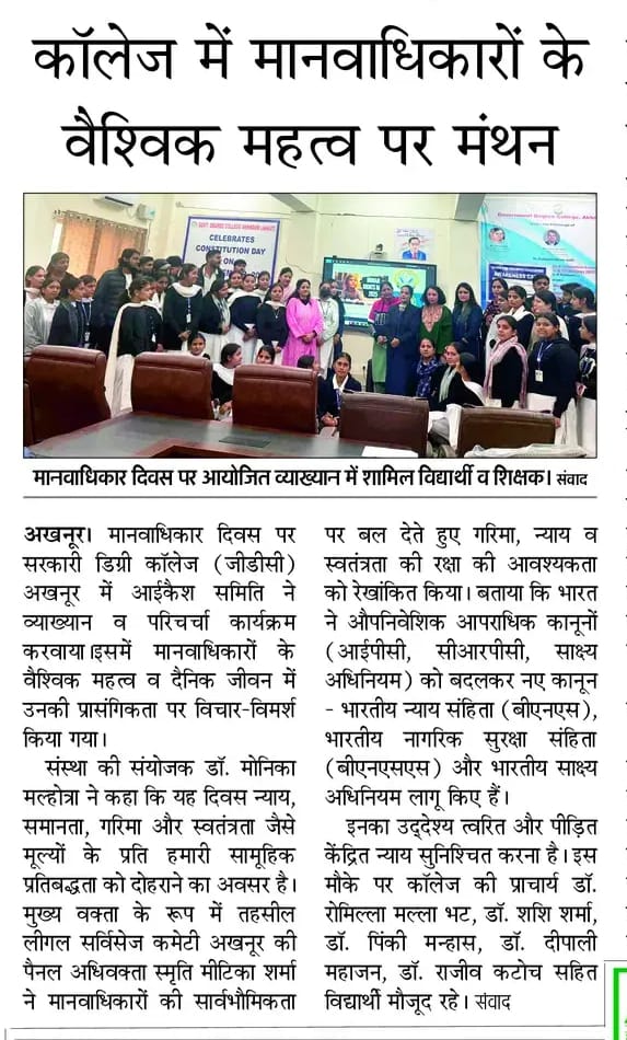 Akhnoor, [9-4-2025] — In a remarkable initiative to foster awareness and action against child abuse, the Human Rights Committee of Government Degree College Akhnoor, under the visionary leadership of Principal Dr. (Prof.) Romilla Malla Bhat, organized a compelling Painting, Sketching, and Cartoon-Making Competition on the theme “Child Abuse: A Silent Crime.” The event aimed to channel the creativity and sensitivity of students towards a grave social issue that often remains hidden behind closed doors. With vibrant participation from 30 talented students, the competition turned into a moving visual campaign that highlighted the emotional, physical, and psychological trauma endured by victims of child abuse. Each artwork was a powerful statement — echoing the cries for justice, empathy, and protection. Through colors and contours, students expressed solidarity with the unheard voices of children suffering in silence in the society. The winners were celebrated for their impactful artistry: Mr. Gaurav clinched the First Prize, followed by Miss Shalini and Neelu, who secured the Second and Third Prizes, respectively. The jury, comprising eminent academicians — Dr. Deepika Gupta, Dr. Monika Malhotra, Dr. Neeru Dhalla, and Dr. Anju Bala — praised the students for their profound interpretation and expression of the theme. The event was meticulously planned and executed by a dedicated team including Dr. Seema Bhau, Dr. Pinki Manhas, Dr. Anju Koul, Dr. Sanjay Kapoor, Prof. Sonu, Dr. Sohnika Rani, and Dr. Shahida Ibrahim, under the able coordination of Dr. Shandilya Perminder Kour. This impactful event not only showcased artistic excellence but also reflected GDC Akhnoor’s unwavering commitment to human rights, social justice, and the well-being of children. By merging creativity with consciousness, the college reaffirmed its role as a beacon of awareness and change.